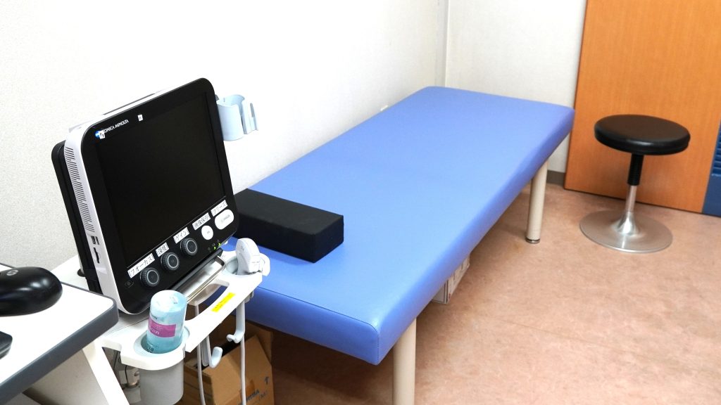 扉で仕切られ、プライバシーに配慮した診察室です。診察時に腹部エコーも行うことができ、検査結果などをモニターでご覧いただきながらご説明します。